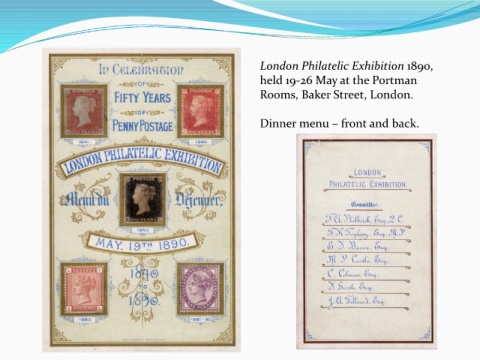 London Philatelic Exhibition 1890, held 19-26 May at the Portman Rooms, Baker Street, London. Dinner menu – front and back.