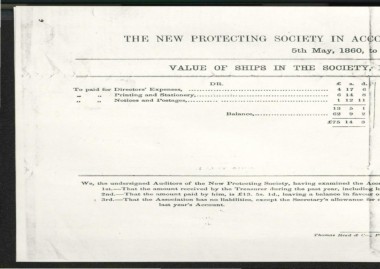 We, the undersigned Auditors of the New Protecting Society, having examined the Account and Balance Sheet of the said Association, do report as follows, viz.-